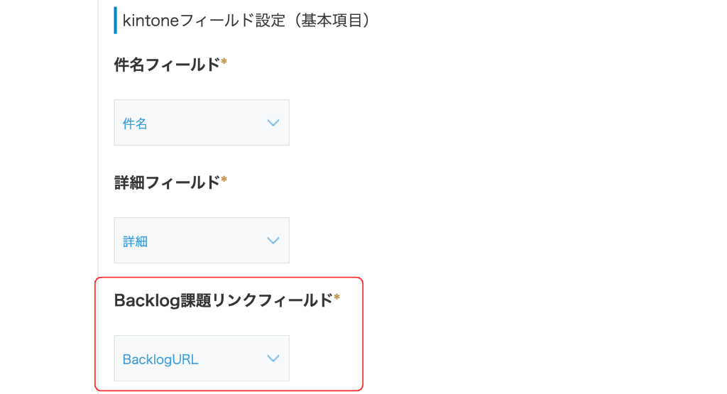 - プラグイン設定画面の「Backlog課題リンクフィールド」にて、(1)で作成した「BacklogURL」を選択してください。