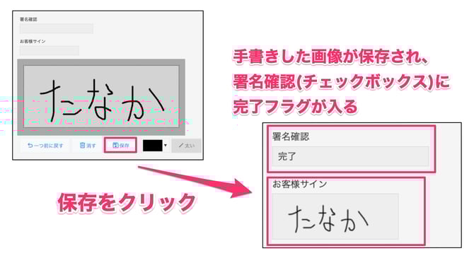 お客様サインに手書き画像が保存された後、署名確認のチェックボックスに完了フラグを入れる。