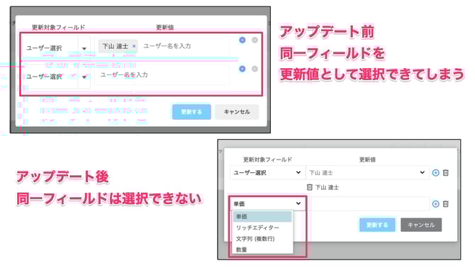 今回のアップデートにより、更新対象フィールドで同一フィールドを選択できないようになりました。