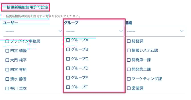 - 一括更新の使用許可設定で「グループ」の選択が可能に