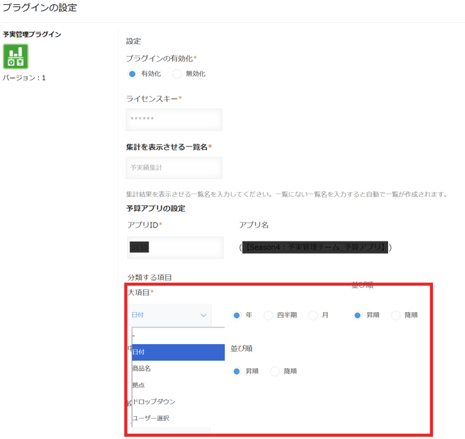 【予実管理】設定できるフィールドは何がありますか? 予実管理プラグインで、大項目および中項目に設定可能なフィールドは、以下の6種類となります。 ・ラジオボタン ・ドロップダウン ・日付 ・ユーザ選択 ・グループ選択 ・組織選択 ▼設定画面で選択可能なフィールドが表示されます。