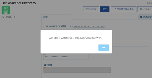 LINE WORKS OCR連携プラグインの設定画面で「利用するAPI URL(またはAPI認証キー)」を入力すると、「API URLとAPI認証キーの組み合わせが不正です。」というエラーが表示されます。